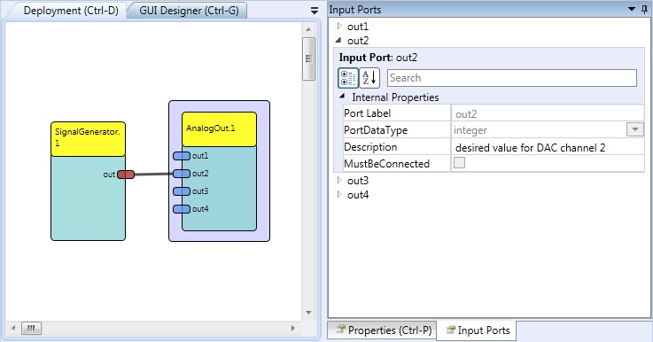 This plugin communicates with the DAC CIM and operates the analog outputs of the module. The plugin provides four input ports which correspond to the four DAC outputs of the CIM.
