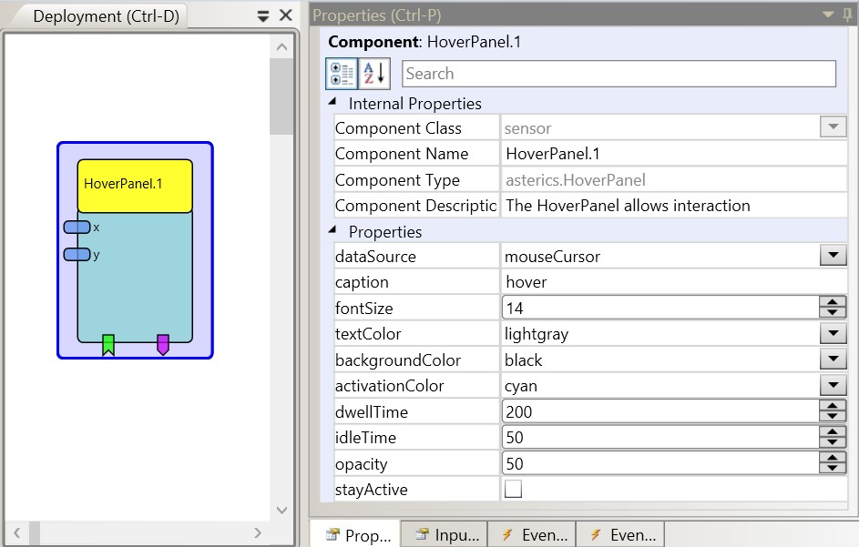 This component creates a panel window with selectable opacity which can be placed anywhere on the screen/desktop. No window decoration is used. The plugin provides x/y input port for coordinates and the panel reacts if these coordinates are located within the panel. Via a selectable hover time, events can be triggered if the coordinates stay within the panel for a given time. Note that the hoverPanel represents a seperate window and is not a child window of the ARE window.